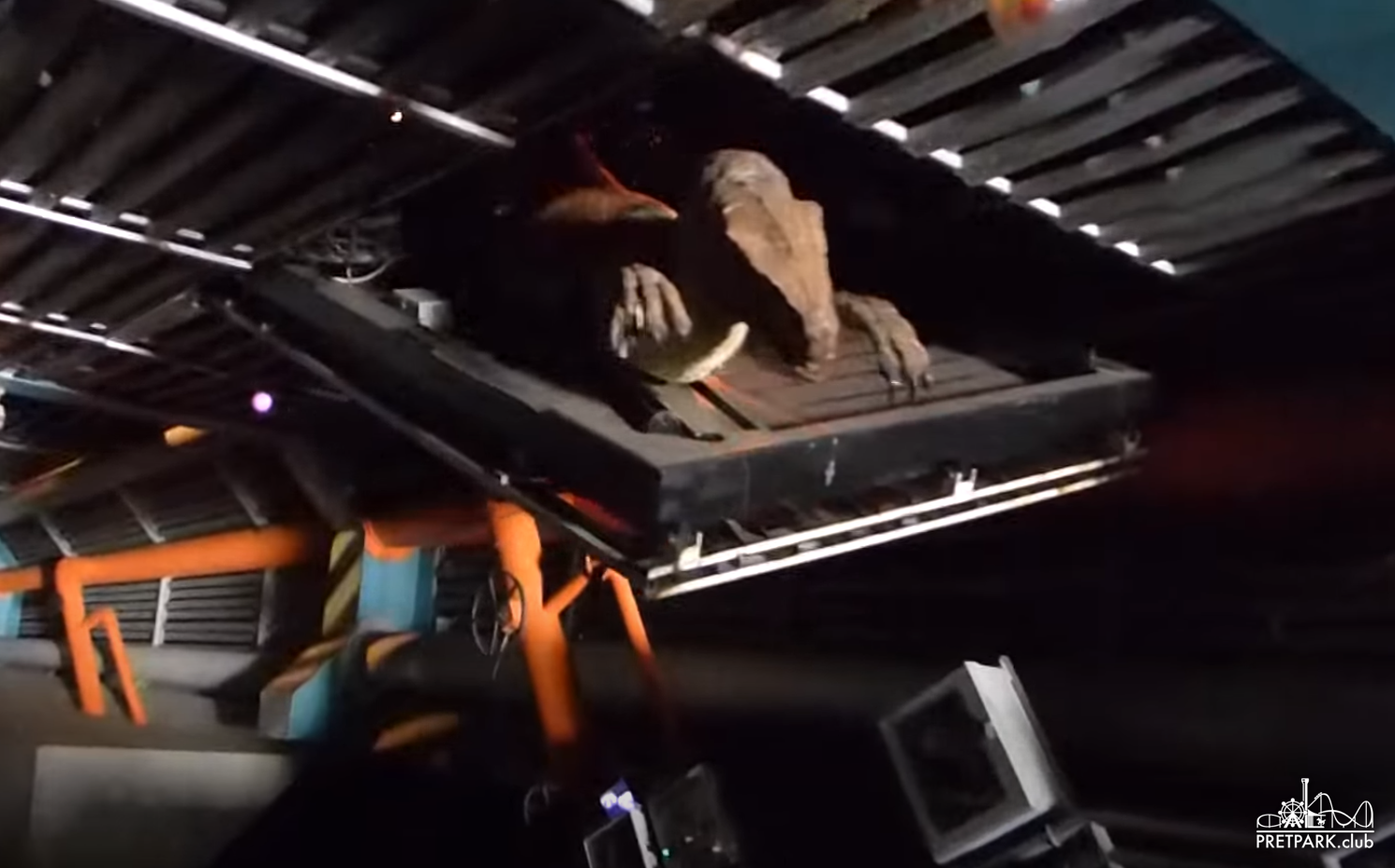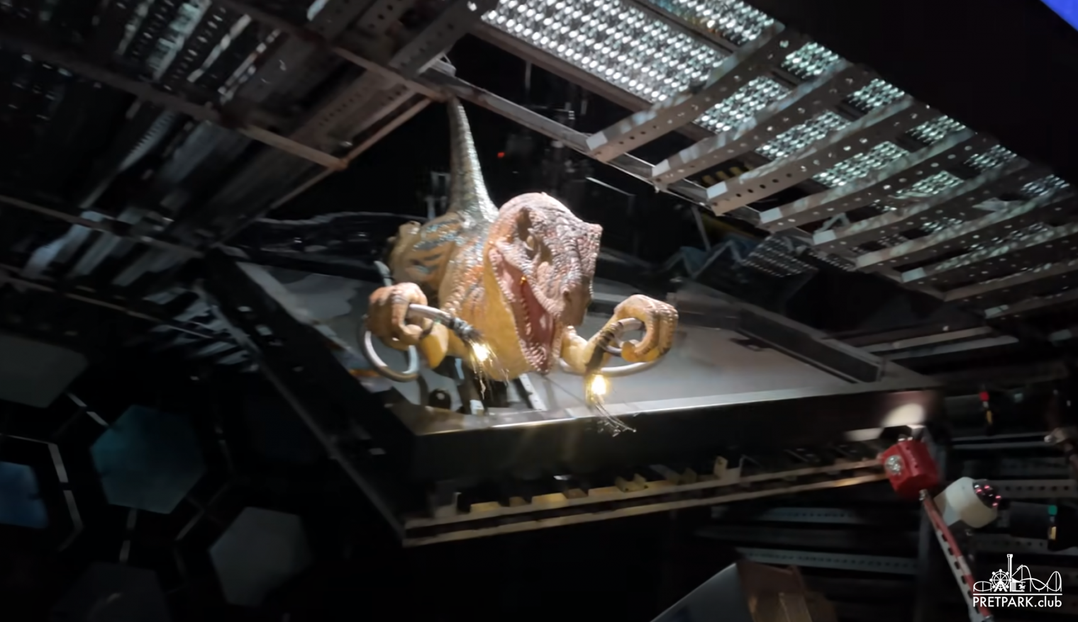 De 3 dino's die nieuw zijn, zijn de Indominus in de eindscene, Blue vlak daarvoor en de T-rex voor je de lifthelling op gaat, en van alle 3 val ik gewoon niet stijl achterover. Blue schuifelt naar voren, en doordat hij uit een donkere hoek kom denk ik dat veel mensen niet eens zien dat die schuift of loopt, zeker ook omdat na een halve seconde je aandacht al naar de Indominus wordt getrokken.