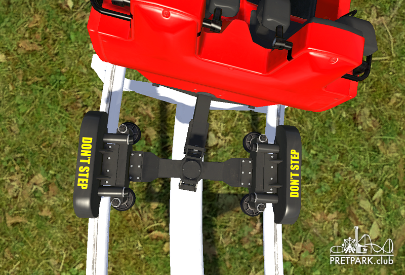 Tegenwoordig maken bijna alle achtbaanfabrikanten gebruik van deze techniek, waaronder ook Vekoma met hun nieuwe generatie achtbanen, maar voorheen maakte zij nogsteeds gebruik van de techniek van Arrow waarbij de linker&rechter bogie direct vast zitten aan de verbindingsstaaf, die in combinatie met beide bogies roteert t.o.v. een rotatieas aan het chassis in het midden van de baan. Ter illustratie hier een screen vanuit NoLimits die ik duidelijk laat zien: