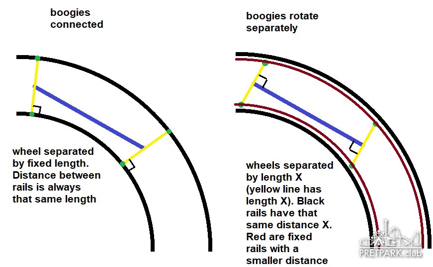 In dit stukje zie je heel duidelijk dat de bogies (Lees: wielset aan 1 kant van het spoor) afzonderlijk kunnen roteren en de verbindingstuk tussen linker-&rechter bogies een frame is dat vast zit aan het chassis van de kar. Dit is een mechaniek die vooral werd gebruikt door schwarzkopf en beter geoptimaliseerd is door B&M om zo achtbanen soepeler te laten lopen. Maar om hier rekening mee te houden is het wel nodig om de spoorbreedte variabel te houden op basis van hoe scherp de bochten zijn. Dit betekent dus dat in scherpe bochten de spoorbreedte kleiner is om zo de wielen op de juiste manier op het loopoppervlak te hebben.