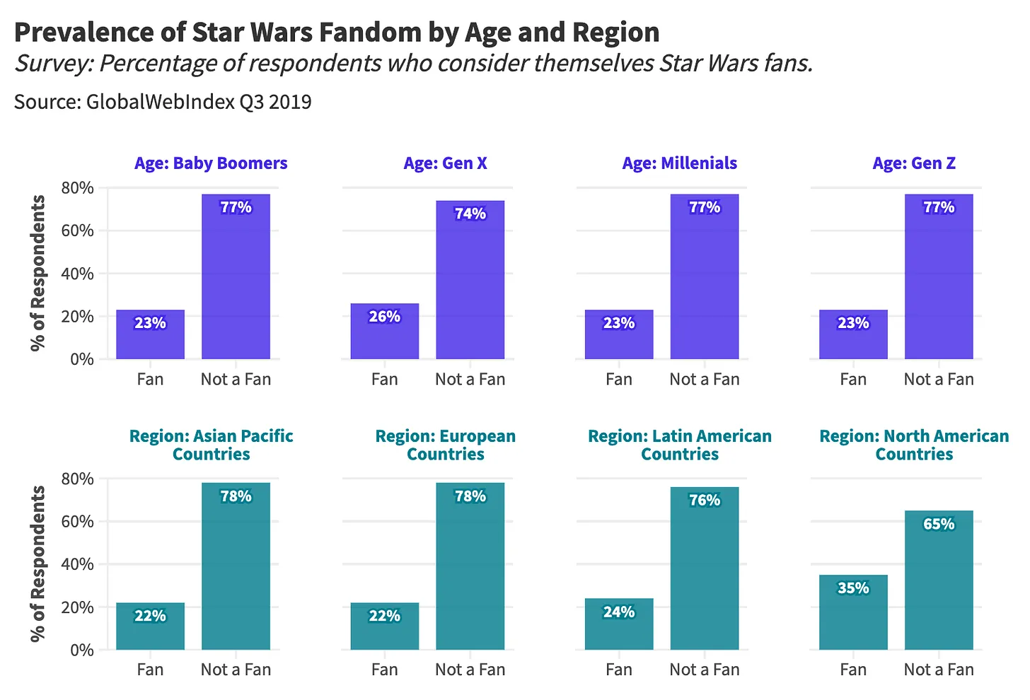 Laten we eerst een kleine breakdown doen van wie zich eigenlijk een fan noemt, er zijn 145.000 mensen ondervraagd in 2019 waarbij er gekeken werd naar de leeftijd (Baby Boomers, Gen X, Millenials, Gen Z) en waar ze vandaar kwamen.