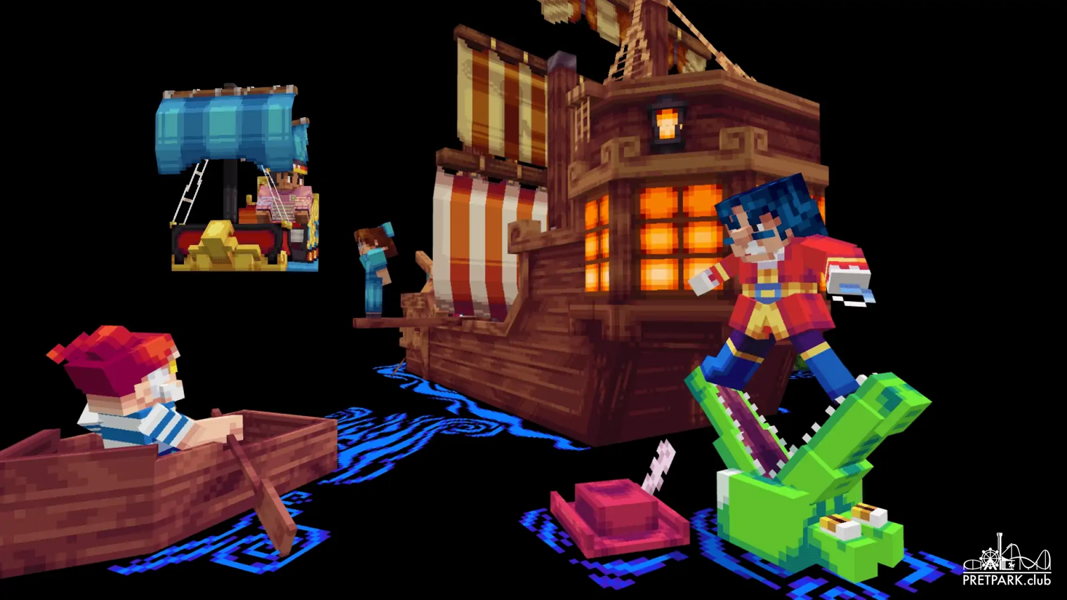 Sinds 2 weken is er op de Minecraft marketplace een nieuwe adventure map beschikbaar. In deze map kun je zelf door een blokkerige Minecraft versie van Disney’s Magic Kingdom lopen en de attracties ervaren. Hiervoor zijn er allemaal props en characters door Everbloom zelf ontworpen en nagemaakt waarvan er nog geen Minecraft versie bestond. Denk daarbij aan de krokodil die Captain Hook probeert op te eten, of zijn hoed die ernaast in het water ligt.