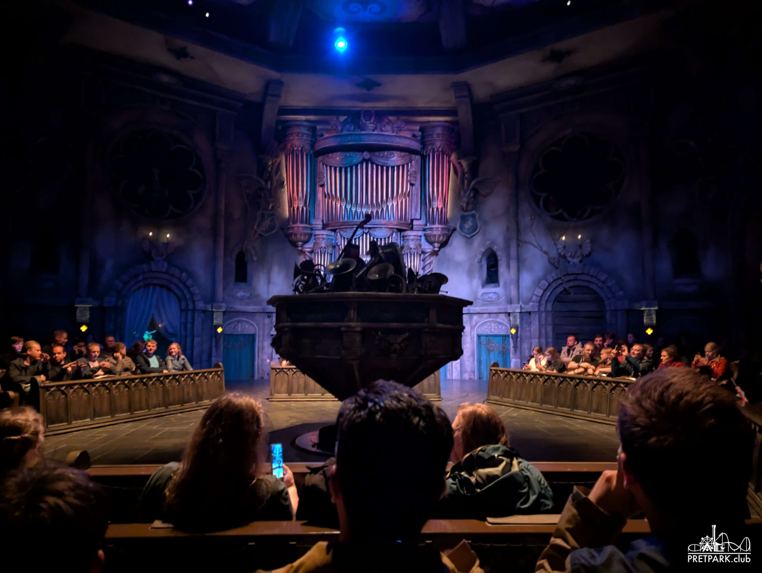 Nadat we toch wel geschrokken waren van hoe pijnlijk deze noodstop was, omdat we echt vanuit de 'vrije val' ergens op leken te vallen, viel ook op dat de schrijf niet recht stond, en er in een van de banken een volledige lege rij en lege stoelen waren. Uiteindelijk is hij wel wat rechter gekanteld tijdens het naar beneden zakken van de schijf, maar bleef er toch wel een gevaarlijk gat over waardoor ze rij voor rij de gasten de show uit hebben begeleidt.