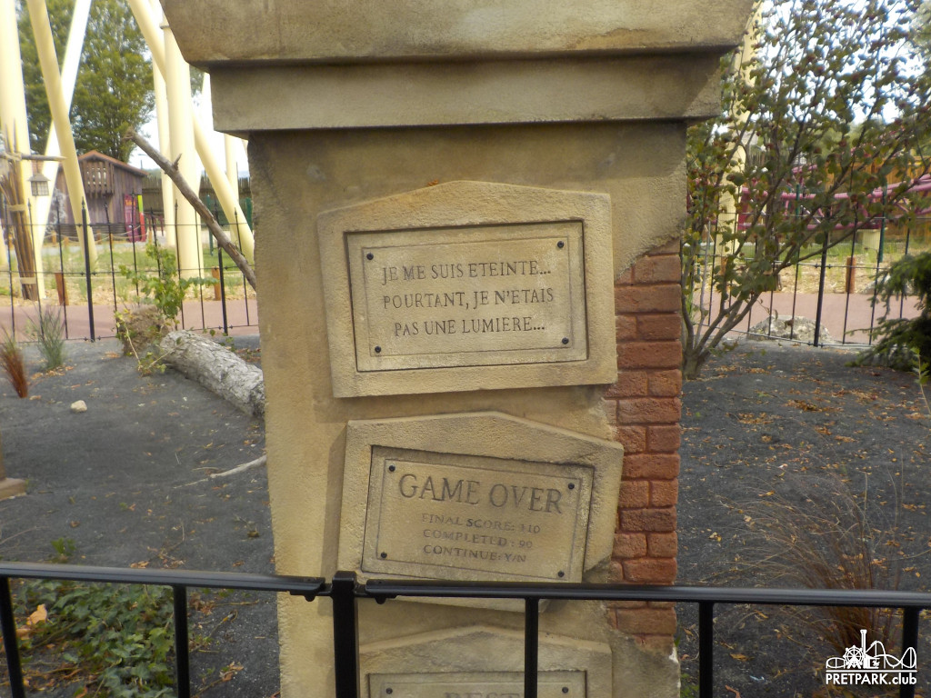 In het station hangen overal voodoo poppen en skeletten oftewel heel mooi gedocoreerd. Dan ga je zitten en krijg je de welbekende beugels van de infinity achtbanen tegen je heup aan.