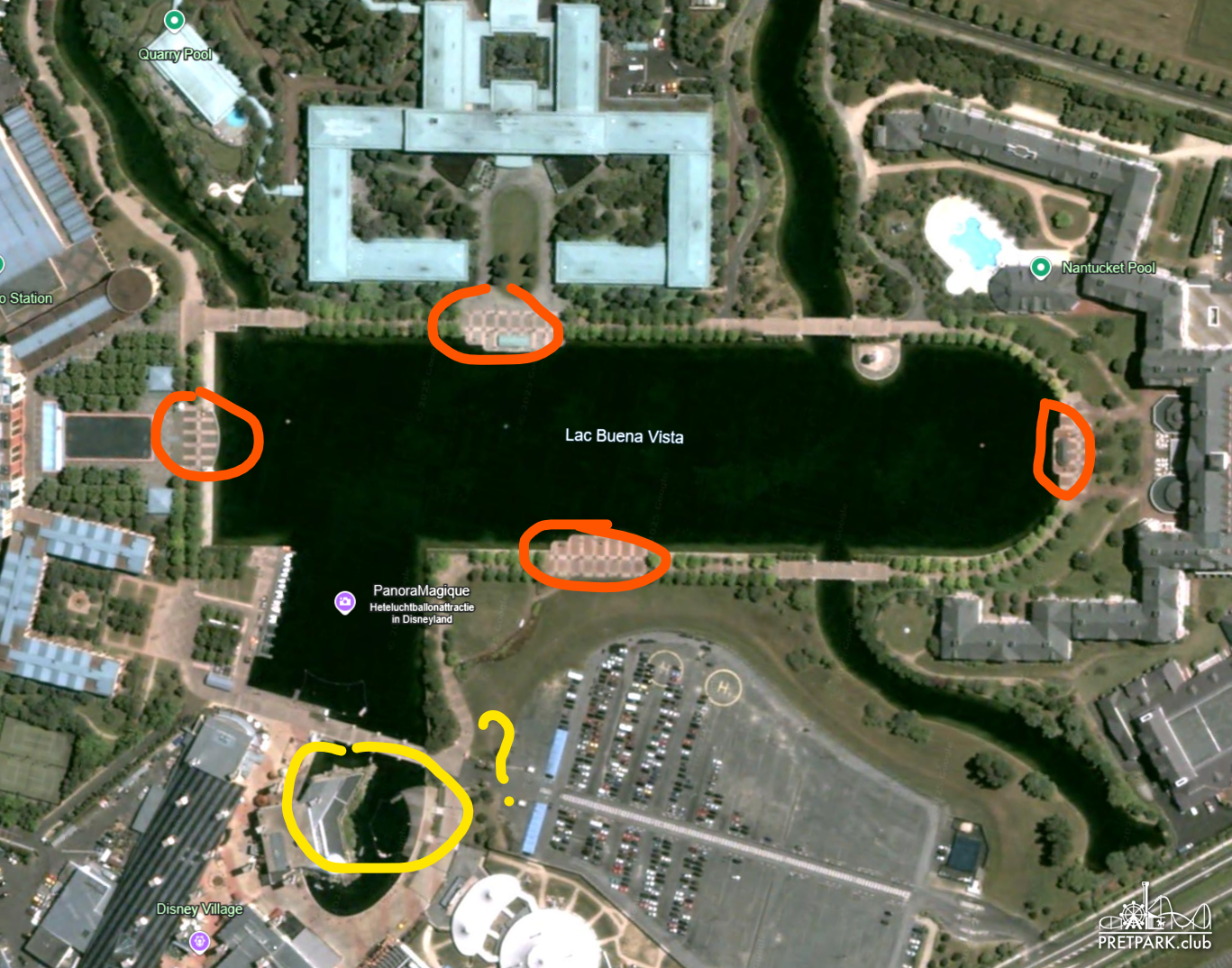 Op Lac Buena Vista (het kunstmatige meer rondom de hotels) zijn er een soort van aanlegsteigers ter hoogte van elk hotel. Daarbij ook nog eentje op de plek van het toekomstige hotel wat nu een lege plek is. Zie onderstaand een Google Earth afbeelding (terug in de tijd naar 2022) in het rood omcirkeld. Met in het geel (vermoedelijk) nog een aanlegsteiger aangezien daar een verlaagd plateau naar het meer toe is.