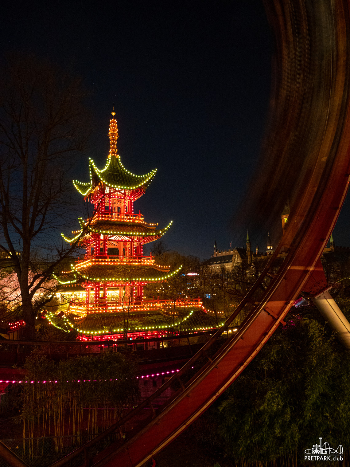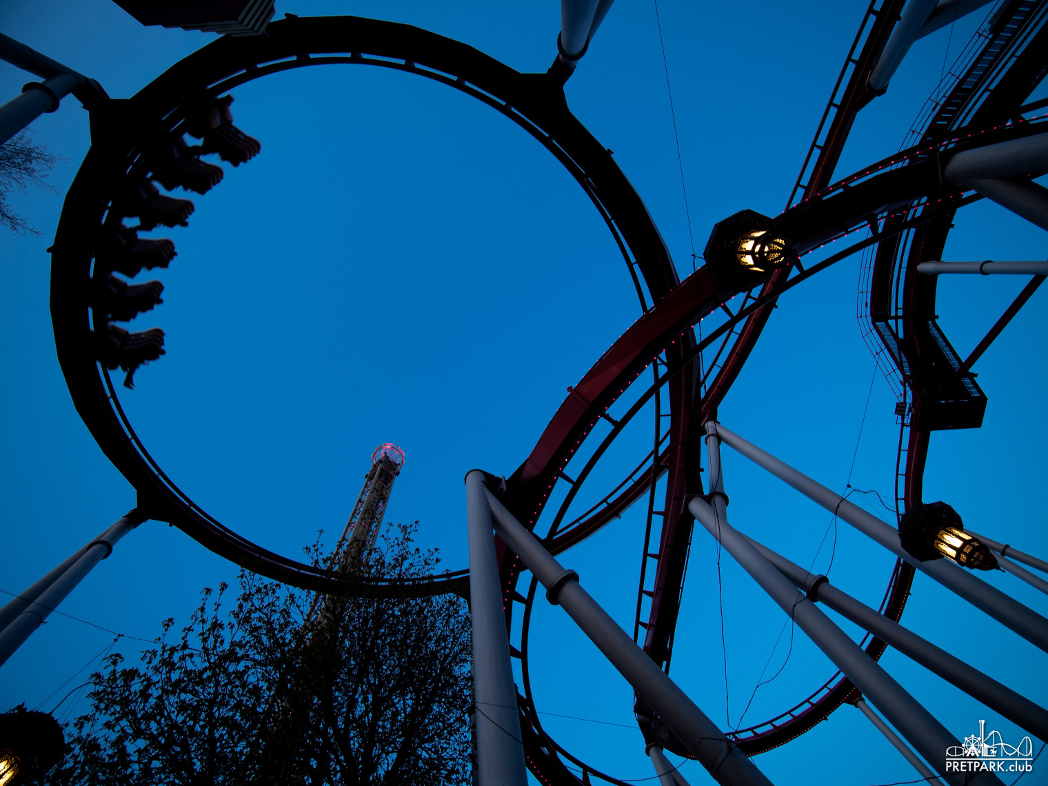 Het is paasvakantie in Denemarken en als gevolg daarvan is het vrij druk in Tivoli. Ik loop een rondje door het hele park om een inschatting te krijgen van de wachttijden en besluit dat ik er maar gewoon aan moet geloven. Maar als je dan toch moet wachten, dan beter voor iets unieks en dat hebben ze hier zeker: houten achtbaan Rutschebanen is met 111 jaar bijzonder oud én rijdt heden ten dage nog altijd met een brakeman aan boord. En ik moet zeggen: wat een fantastische achtbaan! Z’n bescheiden statistieken doen absoluut geen recht aan de ritervaring. Hij geeft kriebels in de buik tijdens de afdalingen, ragt lekker door de bochten heen zonder al te ruw te worden en behoudt zijn snelheid tot het einde. Het geheel is mooi aangekleed als berglandschap en tot mijn verbazing zit er binnen nog een stukje door het pikdonker ook. Ik had niet verwacht Rutschebanen zo leuk te vinden, maar het is wat mij betreft de topper van het park. Fantastische achtbaan om de vakantie mee te beginnen!