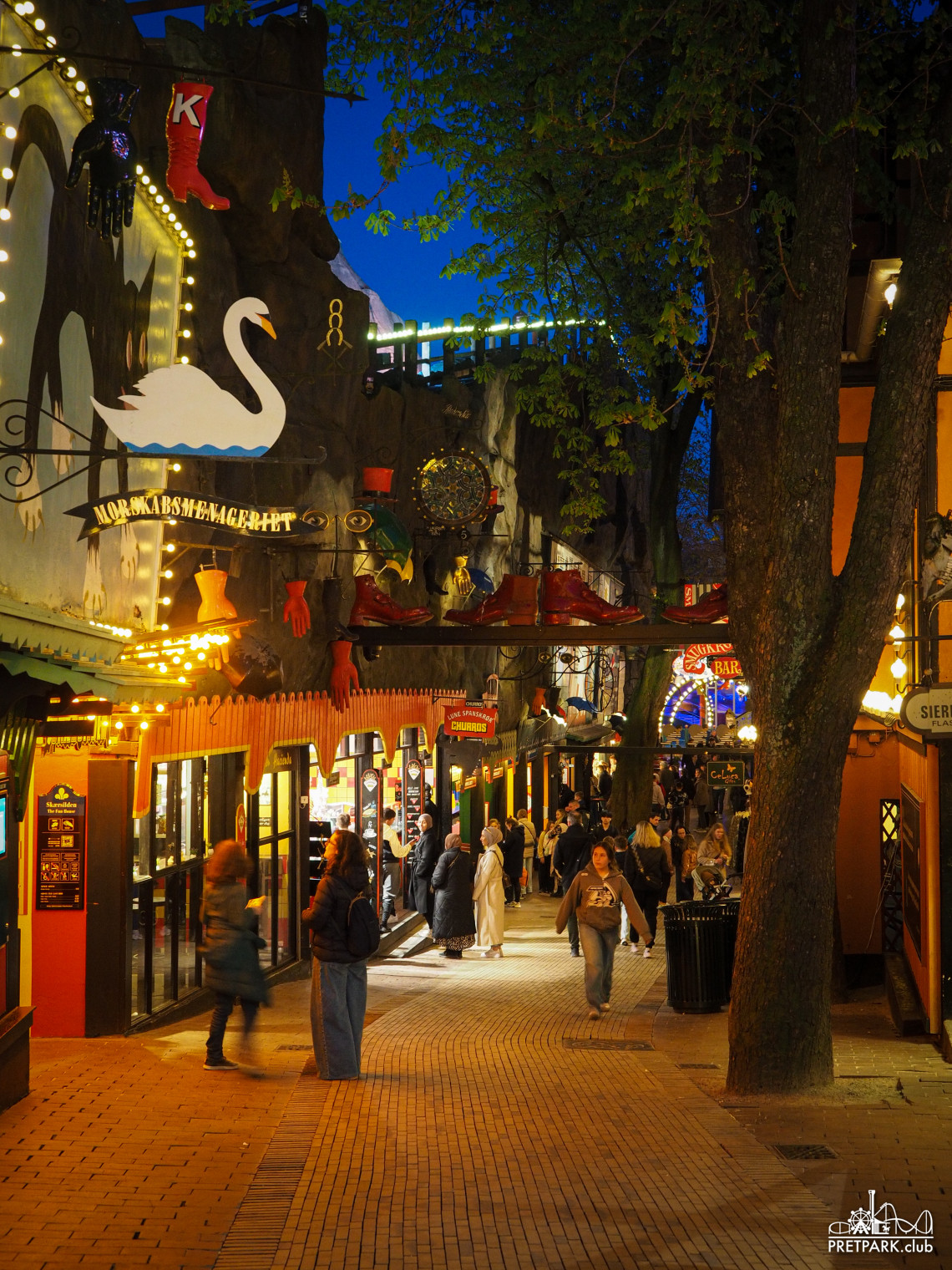 Om kwart over negen heb ik zin in wat lekkers en besluit mezelf te trakteren op churros in het straatje achter Rutschebanen. Nee, voor de liefhebbers van Tivoli die zenuwachtig achter hun scherm zitten: natuurlijk ben ik het straatje niet vergeten! Het is misschien wel het mooiste stukje van het park. In ieder geval is het een van de meest iconische. Dit smalle, steile straatje, met zijn overvloed aan unieke ornamentjes en uithangborden en overdag een krioelende mensenmassa doet me tijdens het bezoek al ergens aan denken, maar pas als ik dit report schrijf weet ik de vinger erop te leggen; als je het mij vraagt is dit het dichtst bij de Wegisweg dat wij Dreuzels kunnen komen. Heel erg fraai met een uitstekend sfeertje.