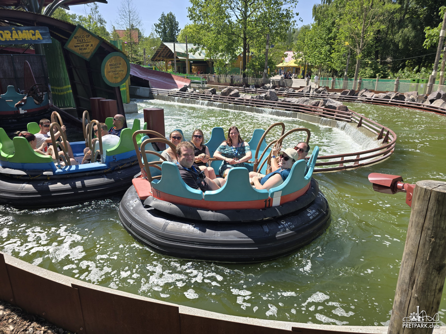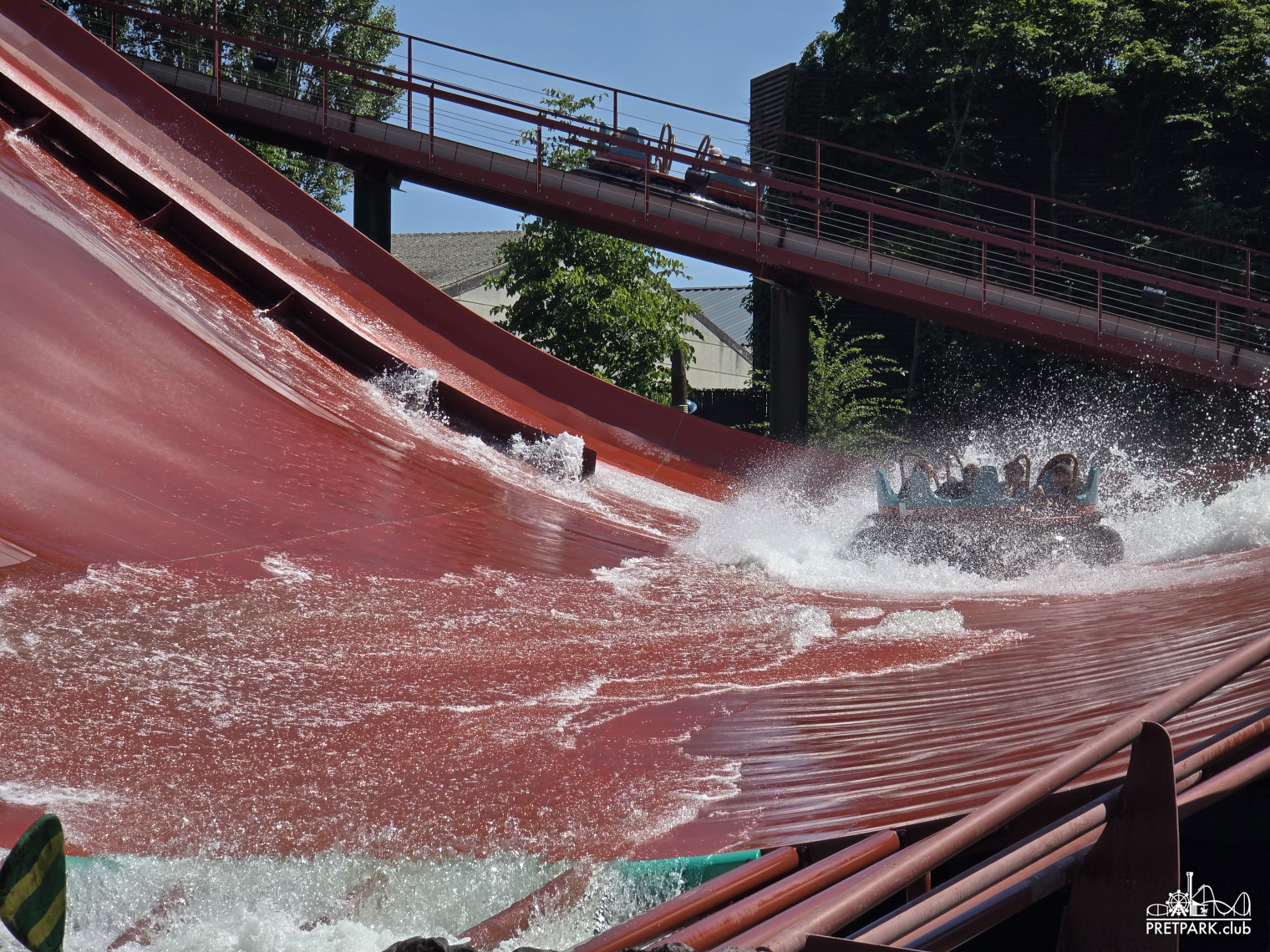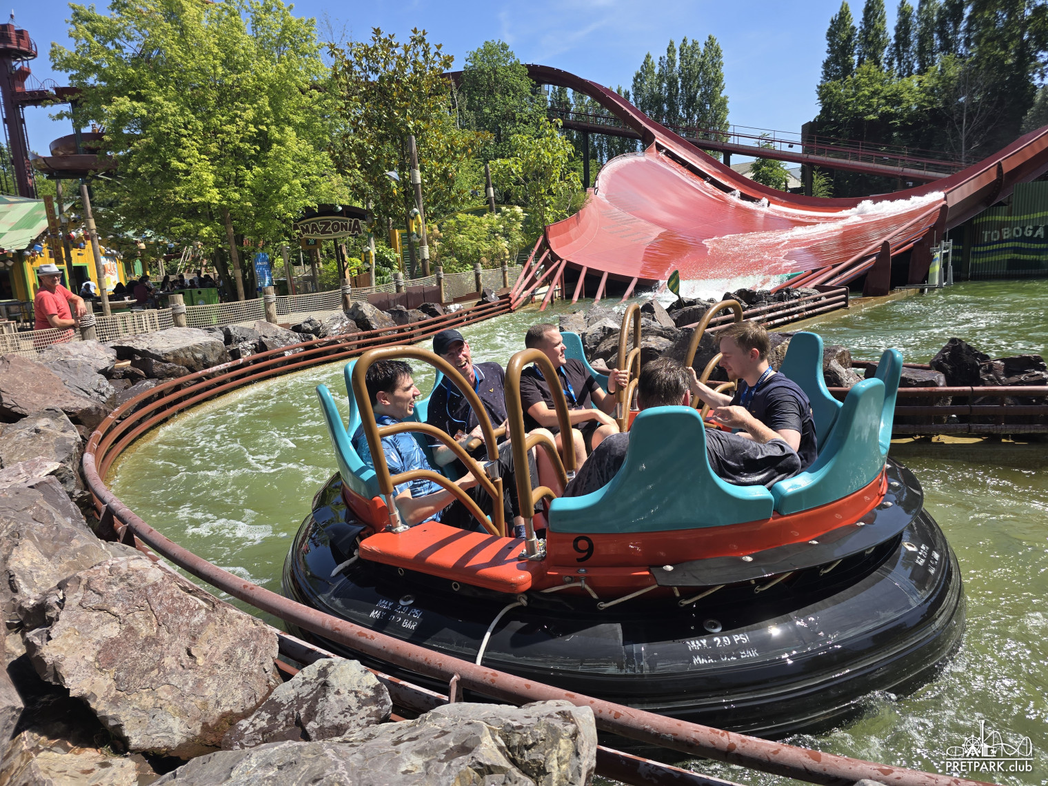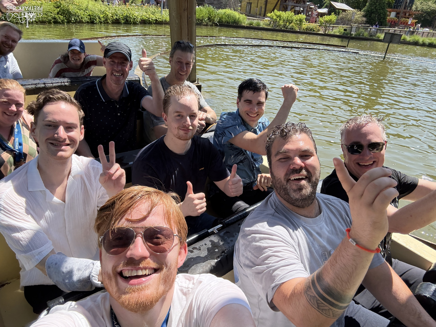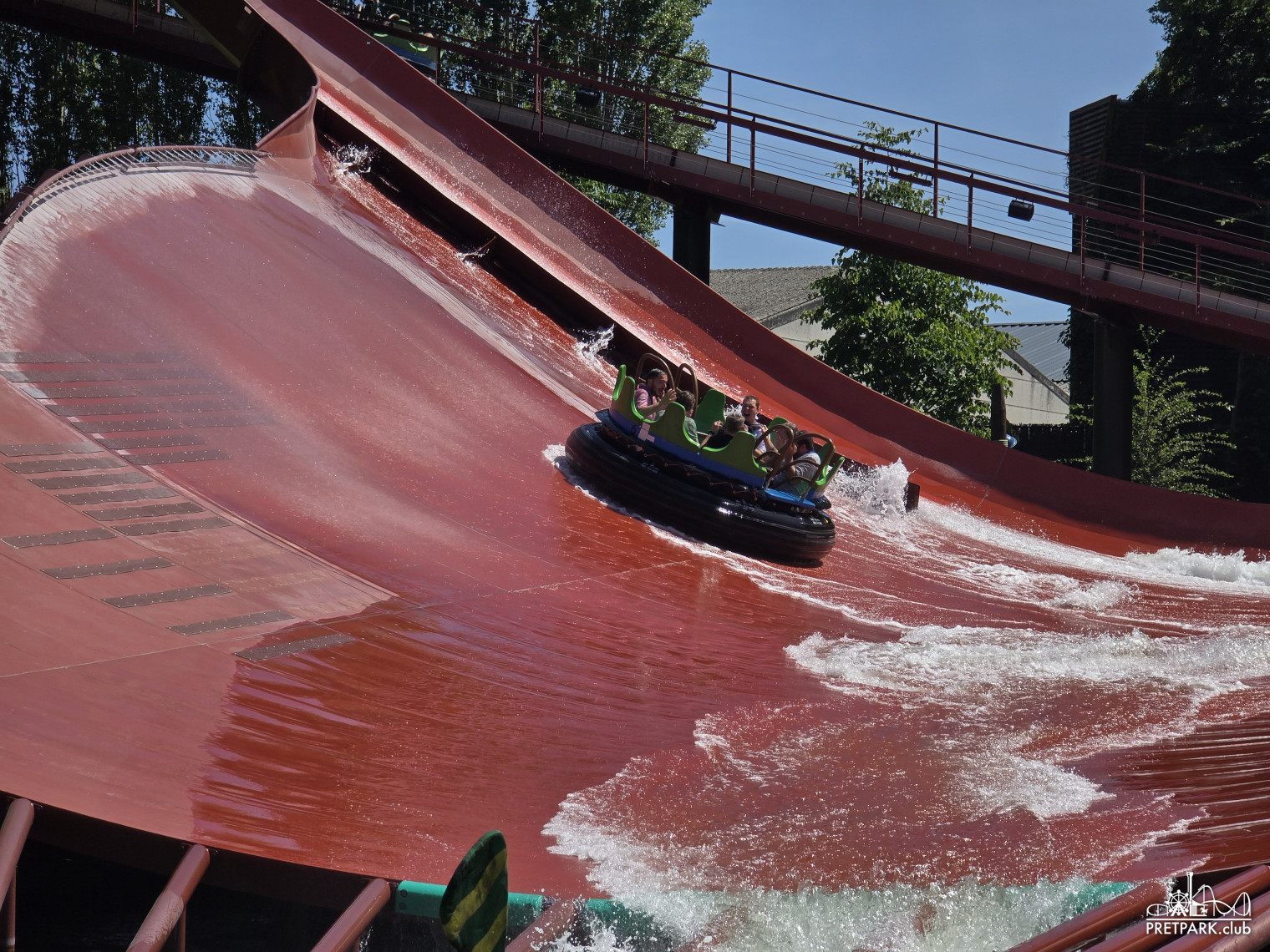 We maken een snelle groepsfoto, leveren onze tassen in bij @Robinho1234 die liever droog blijft en gaan de wachtrij in die inmiddels mooi terug gelopen is naar zo’n 15 minuten. Na een korte wachttijd kunnen we instappen en man, wat is dit een knotsgekke rit. De lifthill gaat enorm snel en de bochtige glijbaan die erop volgt heeft een enorm hoog fun gehalte met een leuke splash op het einde. Daarna ga je de échte lift in die ons brengt naar de glijbaan die uit komt op de grote halfpipe.. Wat een geweld van water is dat, niet normaal. Enorm gaaf om te doen, maar voor mij persoonlijk eigenlijk toch net te nat voor in een pretpark. Ik zou zoiets liever in een waterpark zien.. Dus ik zou zeggen, Mack maar na! Overigens volgt na die laatste splash nog een andere kleine verrassing waar we ook de grootste lol om gehad hebben. Dat ging er stiekem ook ruiger aan toe dan ik verwacht had. Kort gezegd, Amazonia is er geslaagd en tof. Maar echt alleen voor een dag als vandaag want met een iets lagere temperatuur hoef je mij hiervoor niet te bellen. Een groot deel van de groep besluit nog een tweede rondje te maken, ik gebruik hun tweede rondje voor het maken van wat foto’s en filmpjes van bootjes met bekende 😊