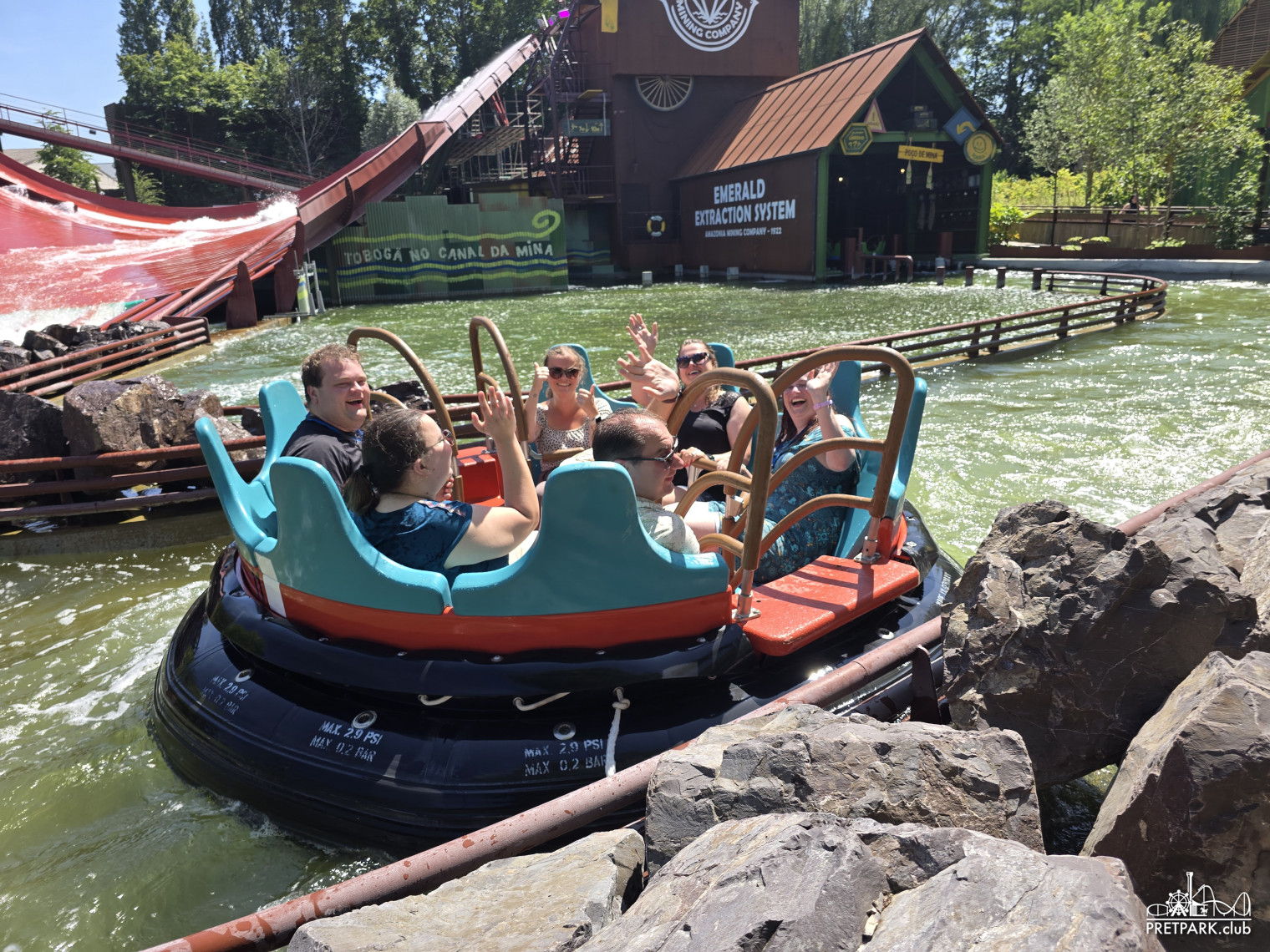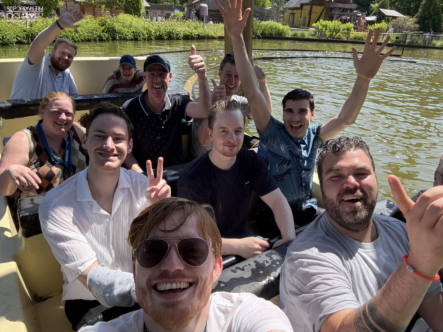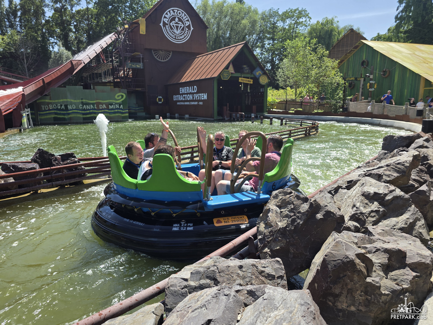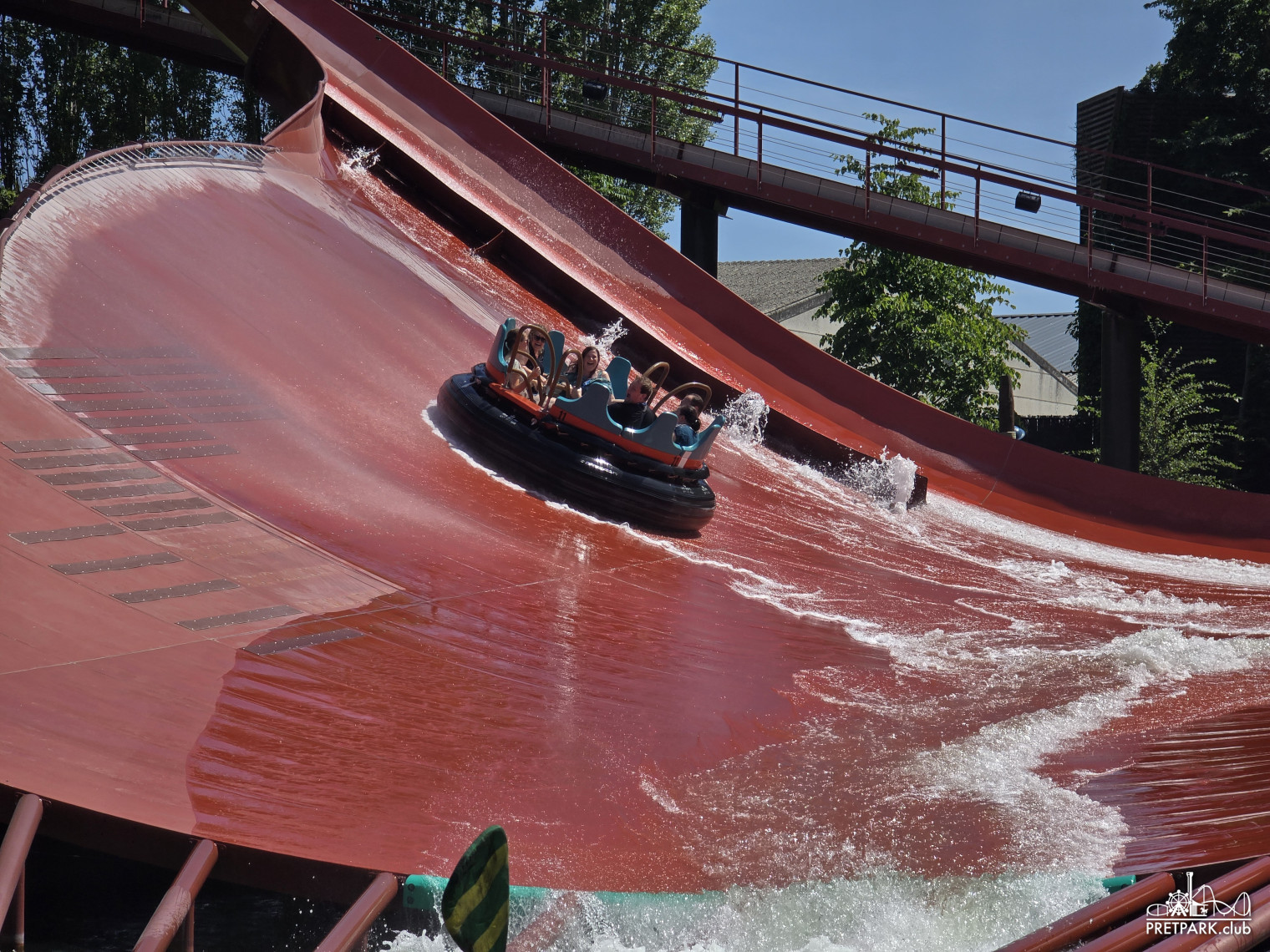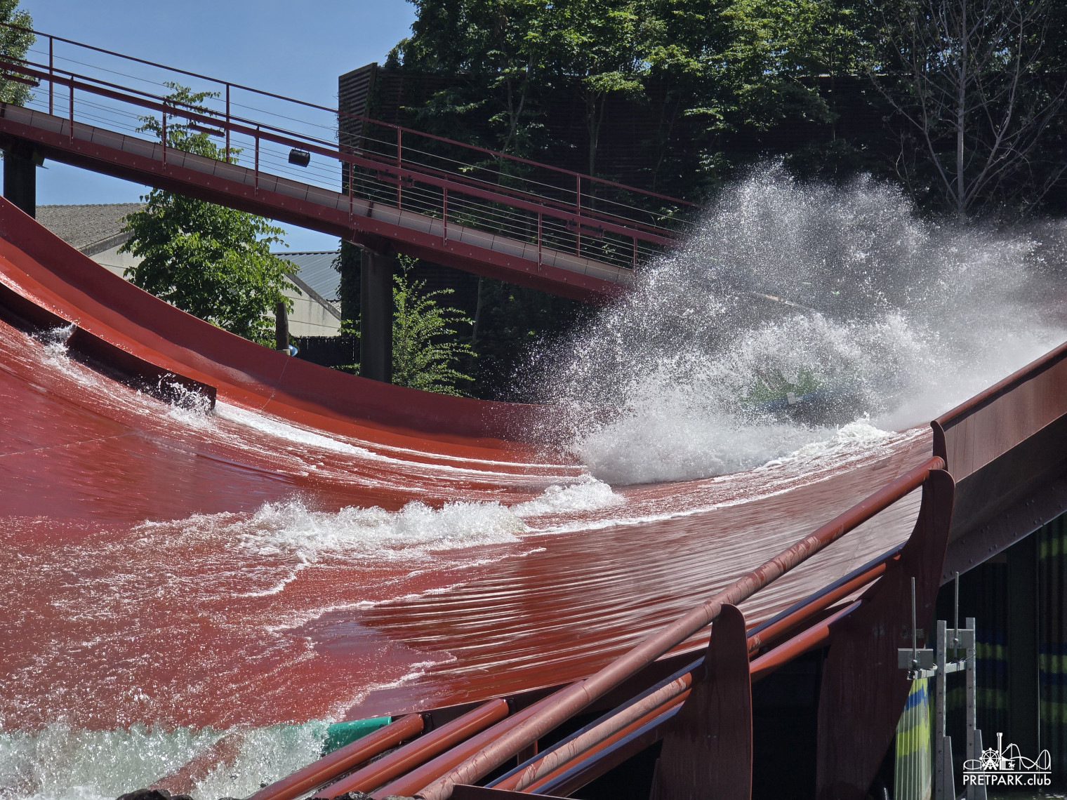 We maken een snelle groepsfoto, leveren onze tassen in bij @Robinho1234 die liever droog blijft en gaan de wachtrij in die inmiddels mooi terug gelopen is naar zo’n 15 minuten. Na een korte wachttijd kunnen we instappen en man, wat is dit een knotsgekke rit. De lifthill gaat enorm snel en de bochtige glijbaan die erop volgt heeft een enorm hoog fun gehalte met een leuke splash op het einde. Daarna ga je de échte lift in die ons brengt naar de glijbaan die uit komt op de grote halfpipe.. Wat een geweld van water is dat, niet normaal. Enorm gaaf om te doen, maar voor mij persoonlijk eigenlijk toch net te nat voor in een pretpark. Ik zou zoiets liever in een waterpark zien.. Dus ik zou zeggen, Mack maar na! Overigens volgt na die laatste splash nog een andere kleine verrassing waar we ook de grootste lol om gehad hebben. Dat ging er stiekem ook ruiger aan toe dan ik verwacht had. Kort gezegd, Amazonia is er geslaagd en tof. Maar echt alleen voor een dag als vandaag want met een iets lagere temperatuur hoef je mij hiervoor niet te bellen. Een groot deel van de groep besluit nog een tweede rondje te maken, ik gebruik hun tweede rondje voor het maken van wat foto’s en filmpjes van bootjes met bekende 😊