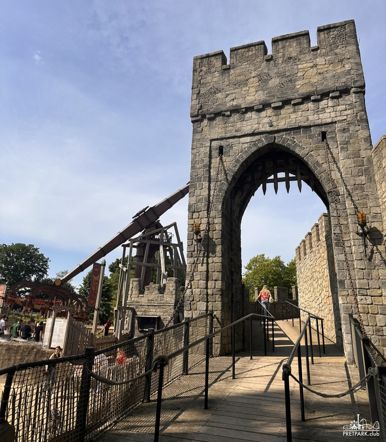 Na even bij de kassa te hebben gestaan om tickets te kopen, gezien ze online geen iDEAL of PayPal betaalfunctie hebben, liepen we richting de poort. Erg imposant, met op de achtergrond Highlander. 120 meter.