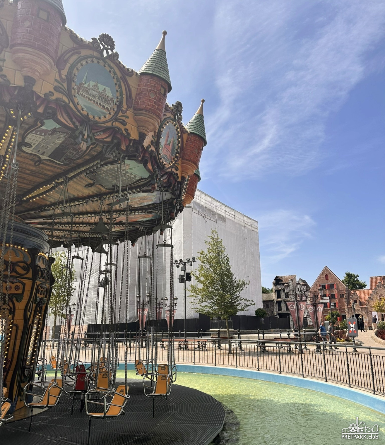 We kwamen uiteindelijk weer uit bij het entreegebied, waar we nog een ritje maakten in de zweefmolen en draaimolen. Beide prachtig gethematiseerd, met op de achtergrond de bouwwerkzaamheden.