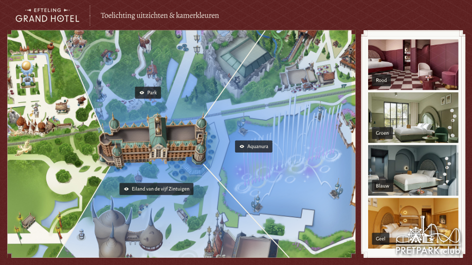 Grappig dat tot nu toe niemand de juiste kleurstelling bij de juiste thema's plaatst, terwijl dit gewoon door de Efteling zelf is gecommuniceerd. De kleurstelling is gebaseerd op de sfeer van een bepaald deel. Niet het uitzicht wat de kamer heeft. De officiële indeling is: