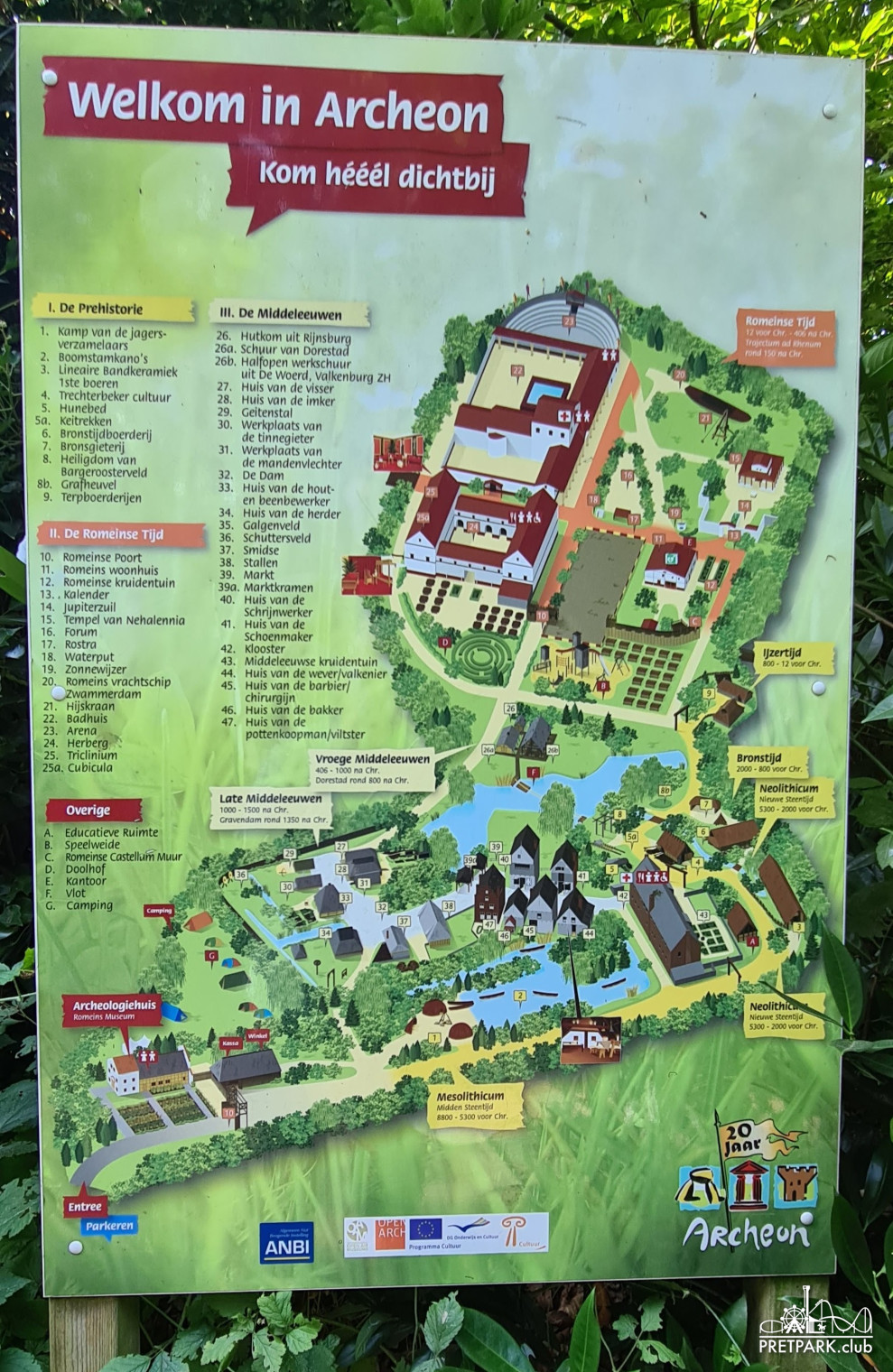 Na een relaxte autorit van iets meer dan 2 uur rijden we de parkeerplaats van het Archeon op. Voor ons als museumkaarthouders is de toegang gratis. Archeon heeft een betaalde parkeerplaats. Vanaf de parkeerplaats brengt een breed bospad je naar de ingang. Het bord met de plattegrond hoef je niet te onthouden hoor. Bij de kassa krijg je een handzamer formaat mee.