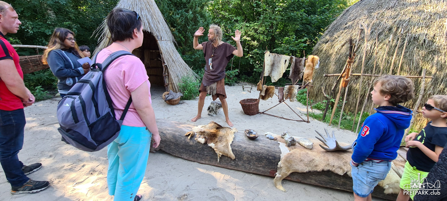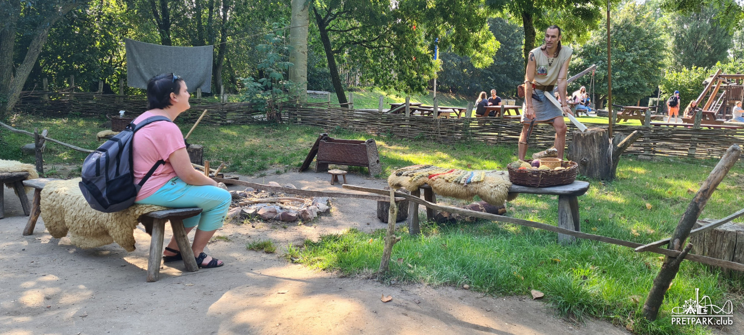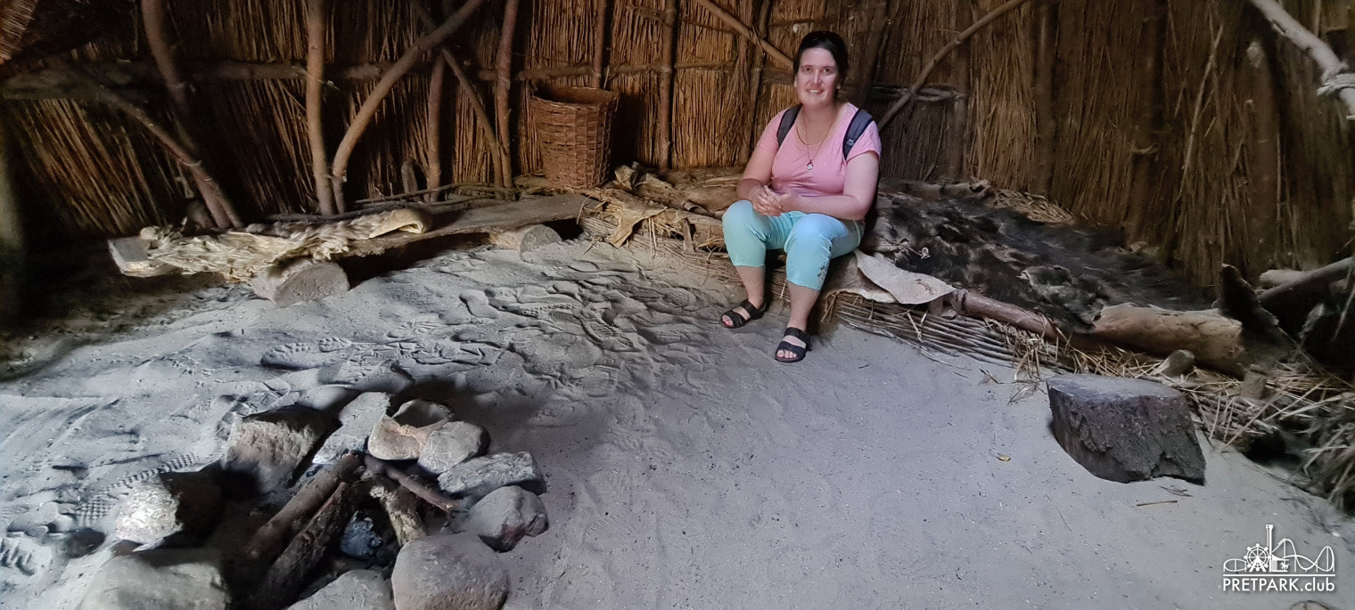 Het eerste tijdperk dat we bezoeken is dat van de prehistorie. Men leefde eenvoudig en heel dicht bij de natuur. Een jager verteld buiten hoe het er in die tijd aan toe ging. Sharon staat geïnteresseerd te luisteren.