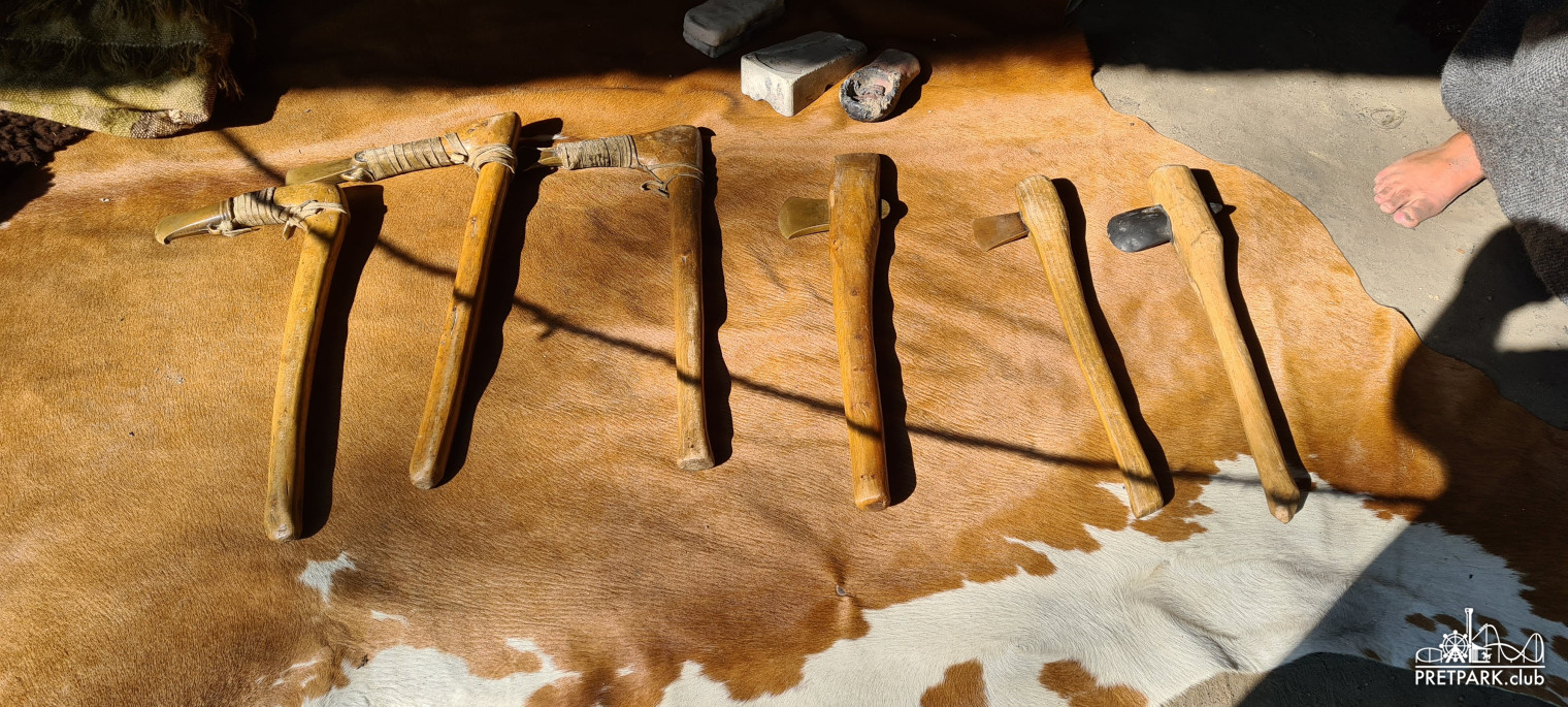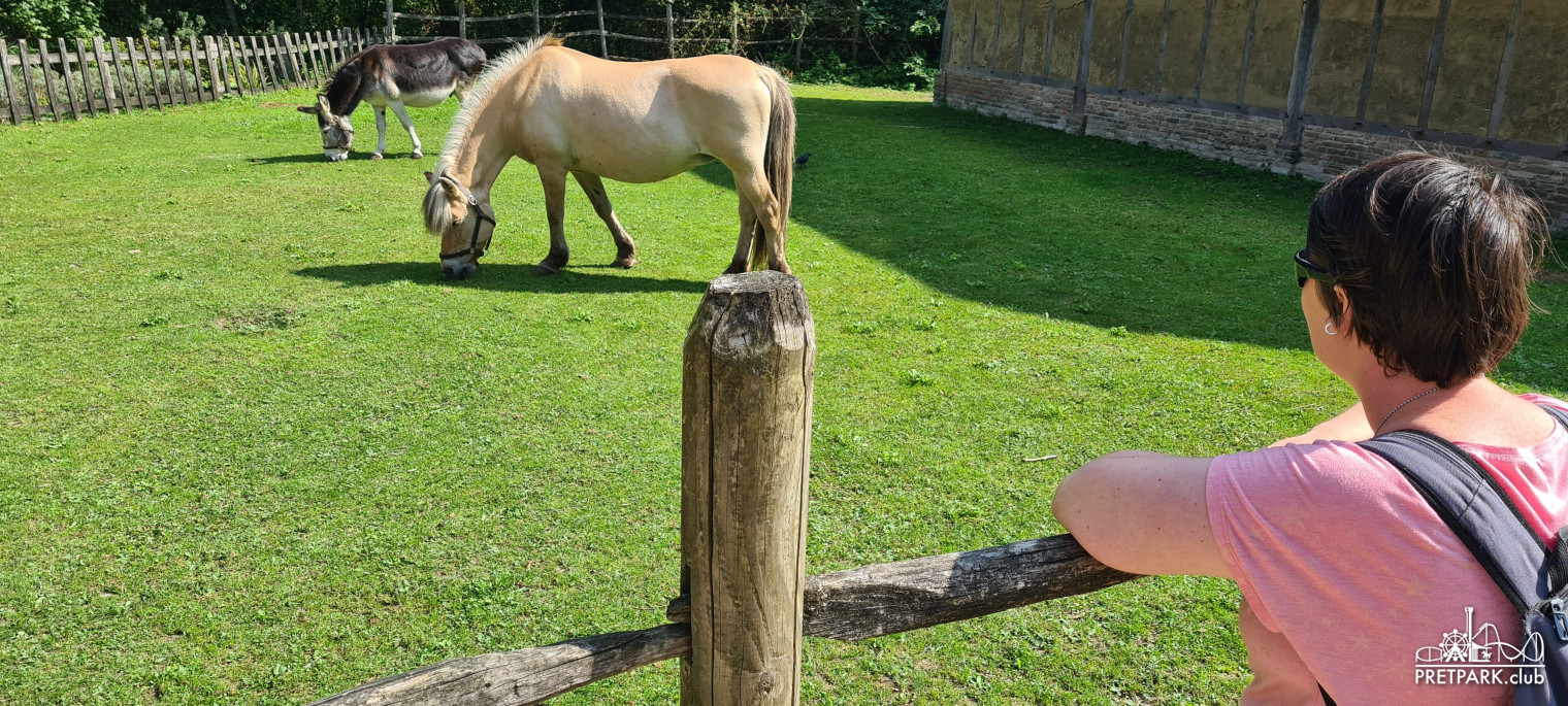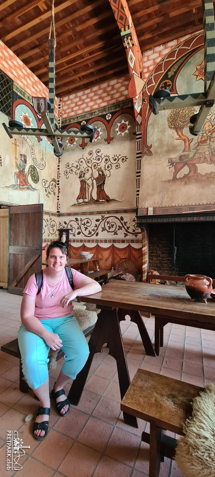 Het eerste tijdperk dat we bezoeken is dat van de prehistorie. Men leefde eenvoudig en heel dicht bij de natuur. Een jager verteld buiten hoe het er in die tijd aan toe ging. Sharon staat geïnteresseerd te luisteren.
