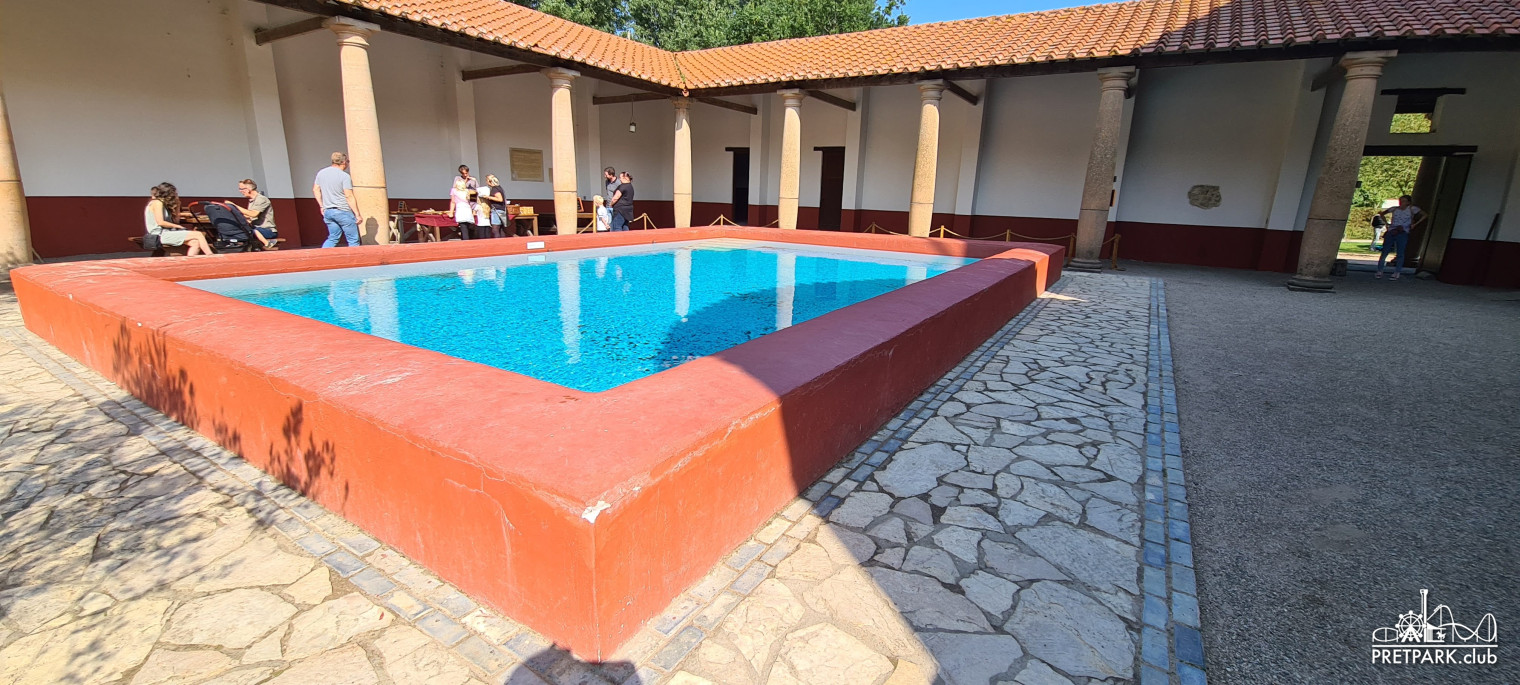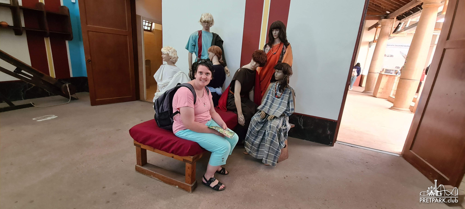 We bezoeken vervolgens de Thermen, oftewel het Romeinse badhuis. Het is een reconstructie van het badhuis dat is opgegraven in Heerlen. We komen binnen in het apodyterium; de kleedruimte van het badhuis. Hier moest je de portier het entreegeld betalen. Je hoeft niet veel te betalen, rijke romeinen schenken vaak badhuizen aan het volk in de hoop stemmen te werven. Op die manier kunnen ook arme Romeinen wel één of twee keer per week naar het badhuis. De keizerlijke badhuizen zijn zelfs helemaal gratis.