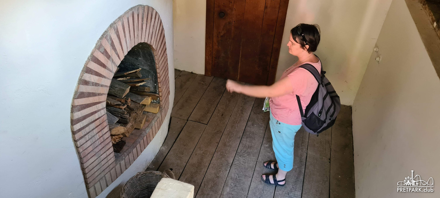 Voor het vuur zie je een keerbank staan. Je kunt bij deze bank de rugleuning “keren”, zo kan het vuur je voorkant, maar ook je rug verwarmen. Wanneer je doorloopt kom je in de keuken, achter in de keuken vind je een sekreet, de wc. Dat is grote luxe want meestal staat die buiten. Er zit geen deur in het sekreet, dit is veel gezelliger!