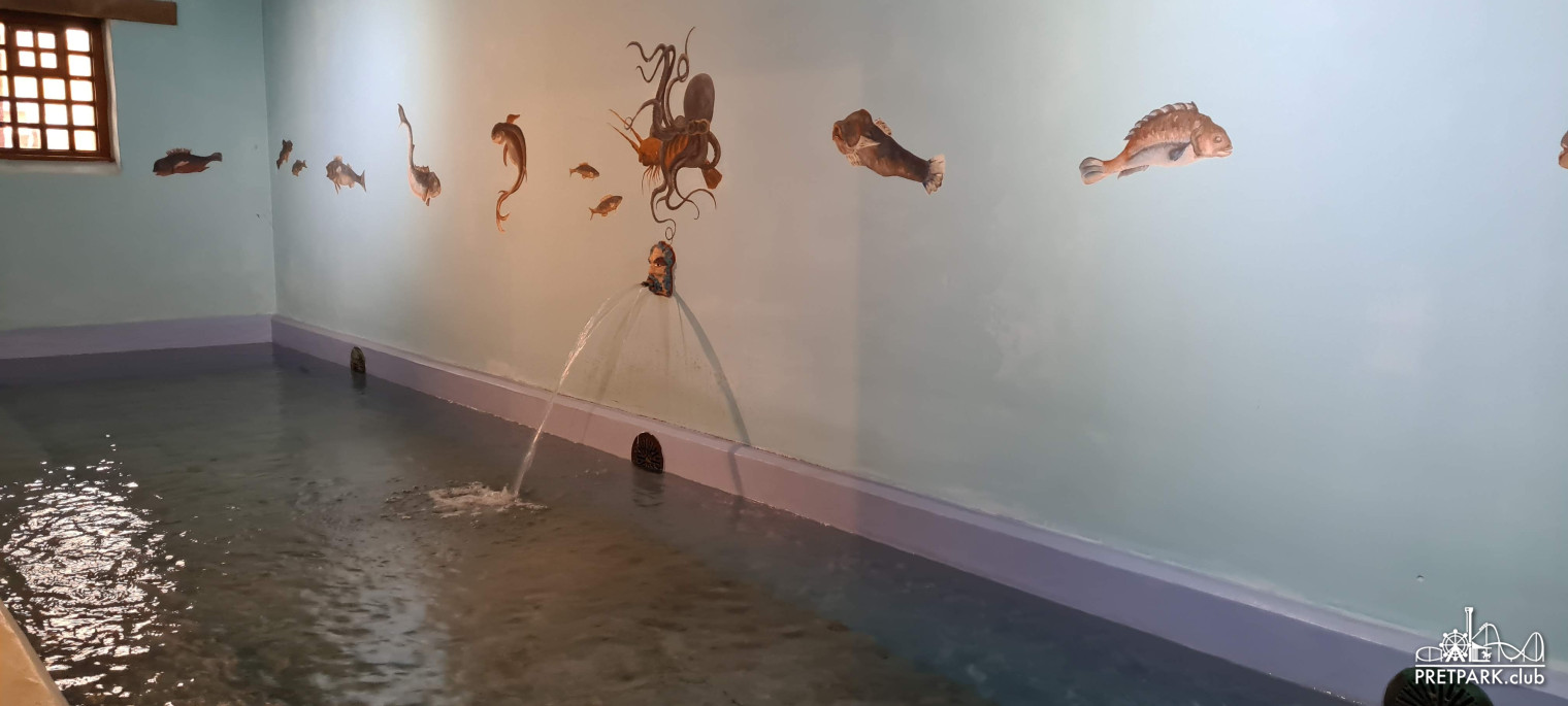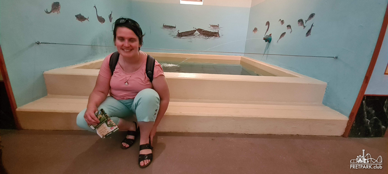 Dit is het Caldarium, het warme bad. Hier kun je heerlijk genieten van het warme water. Achter het caldarium zit de stookruimte. Hier wordt het water verwarmd. Tegelijkertijd zorgt het voor de verwarming in het badhuis, door de holle ruimte onder de vloer en de buizen in de muren, het hypocaustum, waar we het eerder over hadden. Sharon stookt het vuur voor de sauna nog wat hoger op. Zekerheid voor alles he... Net als in de sauna zie je ook hier een koepelvormig plafond zodat de warme druppels weer naar het gootje aan de zijkant kunnen lopen. De fonteintjes aan beide zijde van het caldarium spuiten koud water om je een beetje te verkoelen. Je hoort je eerst te wassen voor je het bad in mag.