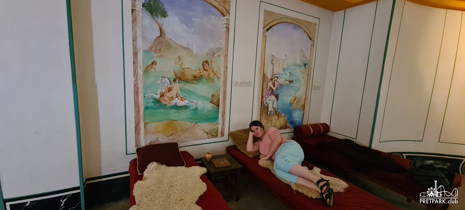 Op de ligbanken in deze ruimte kun je even uitrusten, wat zaken bespreken of lekker iets eten. Boven de bedden zie je prachtige muurschilderingen.