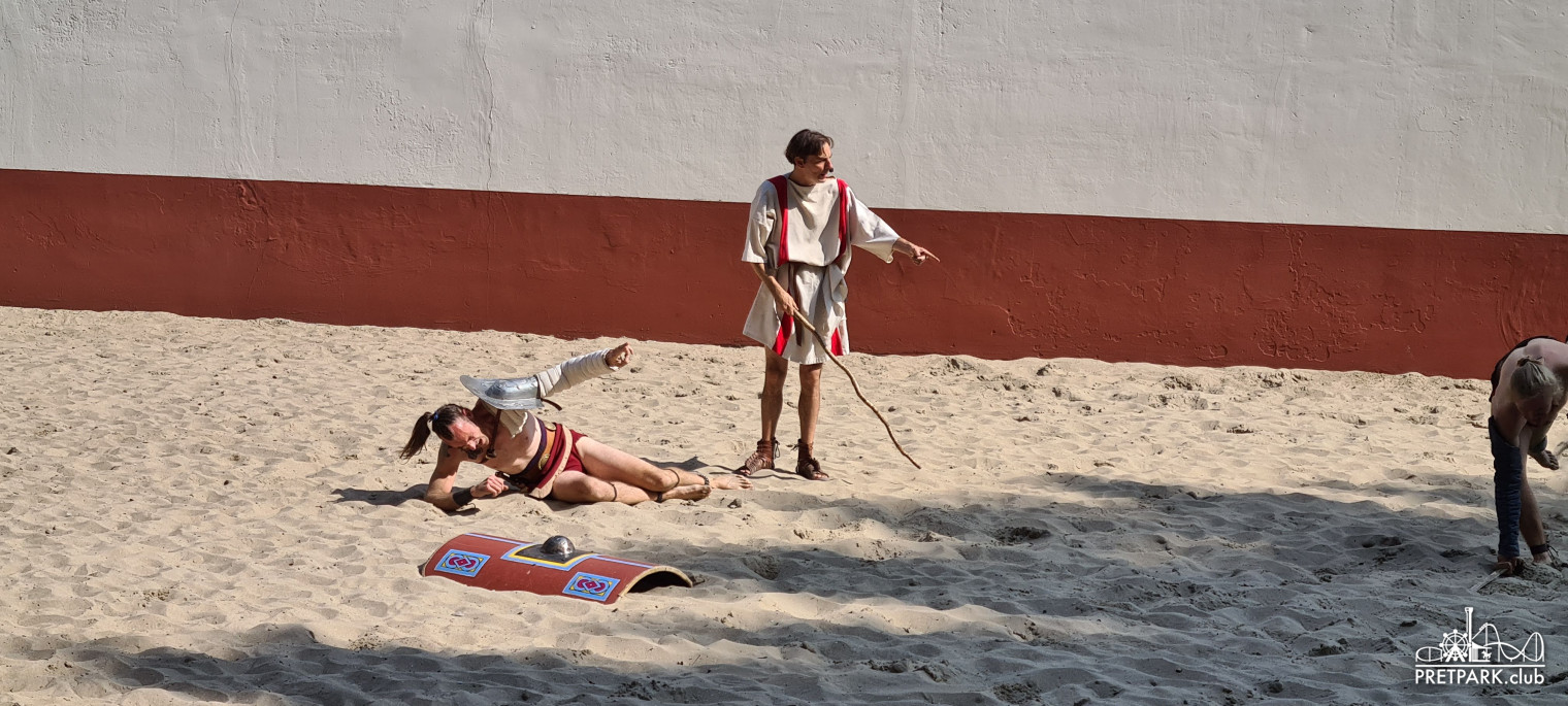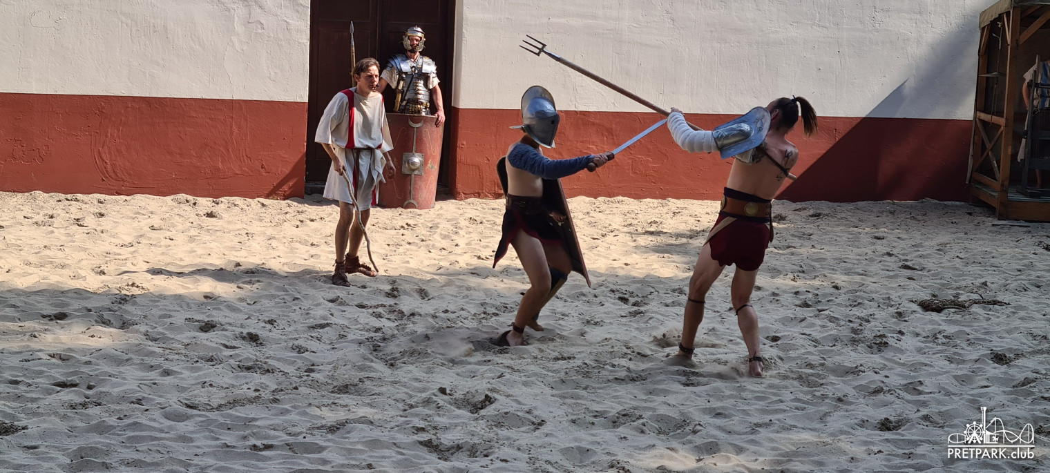 De traditie van het gladiatorengevecht stamt uit de tijd waarin rituele gevechten op leven en dood worden georganiseerd. De gladiatoren in Archeon strijden een keer per dag niet voor leven of dood maar voor hun vrijheid. Na het gevecht kun je de gladiatoren buiten de arena ontmoeten.