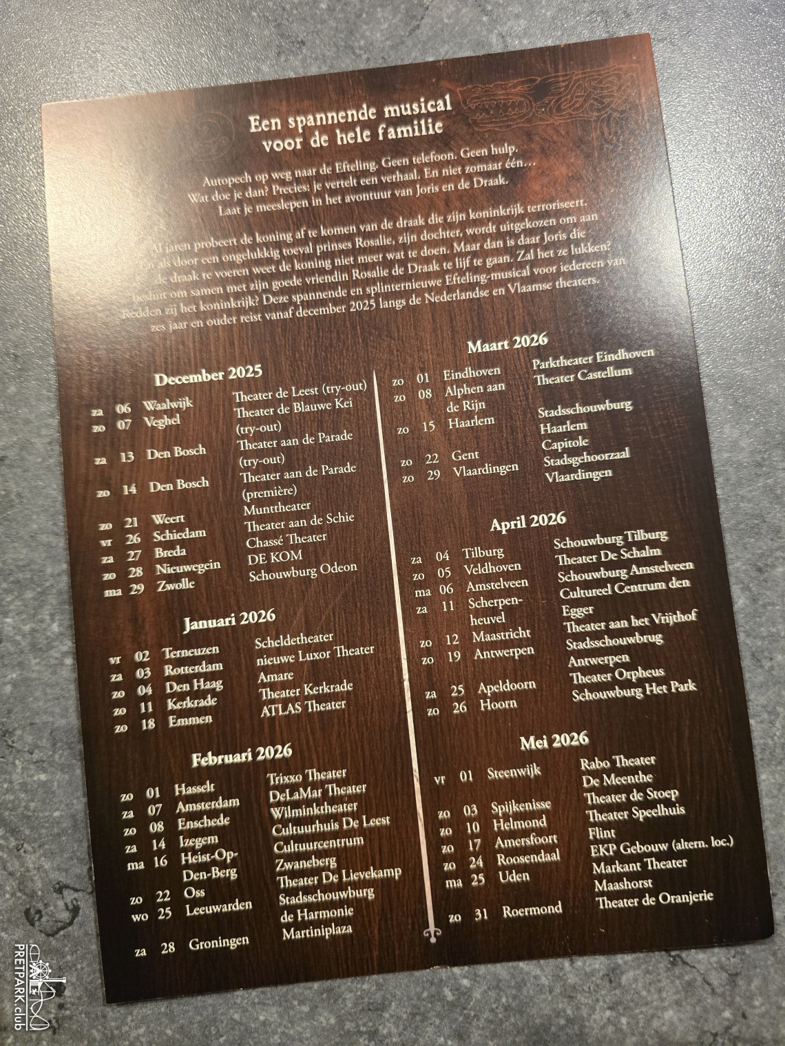 Men is bewust weggebleven van de term “familiemusical” omdat het juist net wat stoerder over moet komen. Niet alleen de 6+ doelgroep met het leuk vinden maar ook de net wat oudere kinderen. Daarom is ook bewust gekozen voor de naamgeving “Efteling vertelt… Joris en de Draak” en niet zozeer musical (al zie je dat, net als familiemusical, toch nog best wel voorbij komen in de communicatie). Men noemt het zelf ook een avonturenmusical om het stoere te benadrukken. Mark vertelde ook dat we Roald Dahl achtige grappen maar ook die hardheid kunnen verwachten. Al werd ook een paar keer benadrukt dat de voorstelling nog in productie is en nog niks in steen gegoten is. Wat ze wel zeker weten is dat de show in ruim 40 theaters in Nederland en België te zien zal gaan zijn.