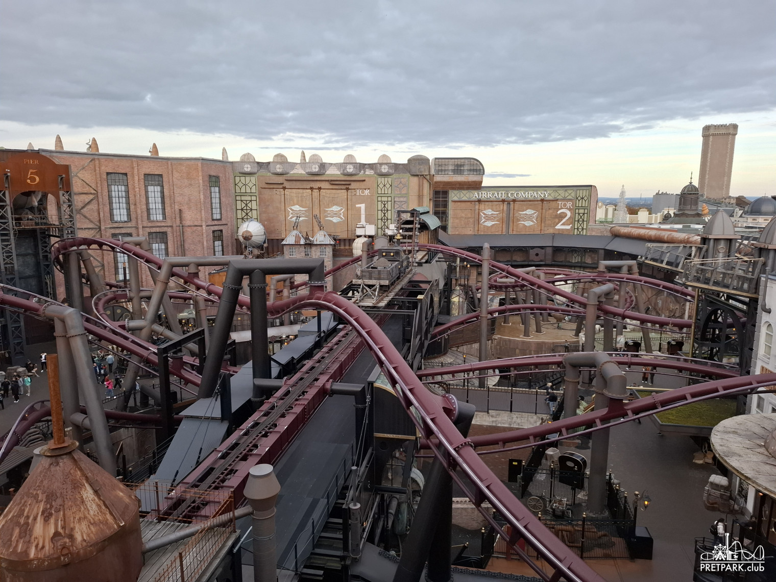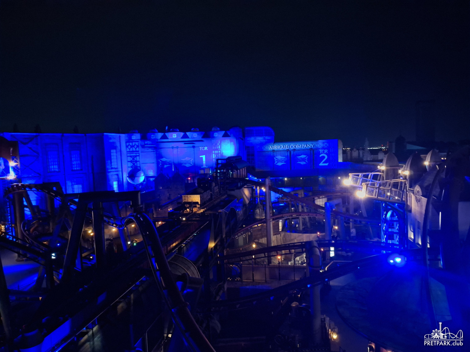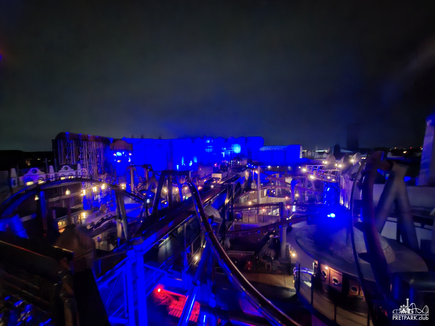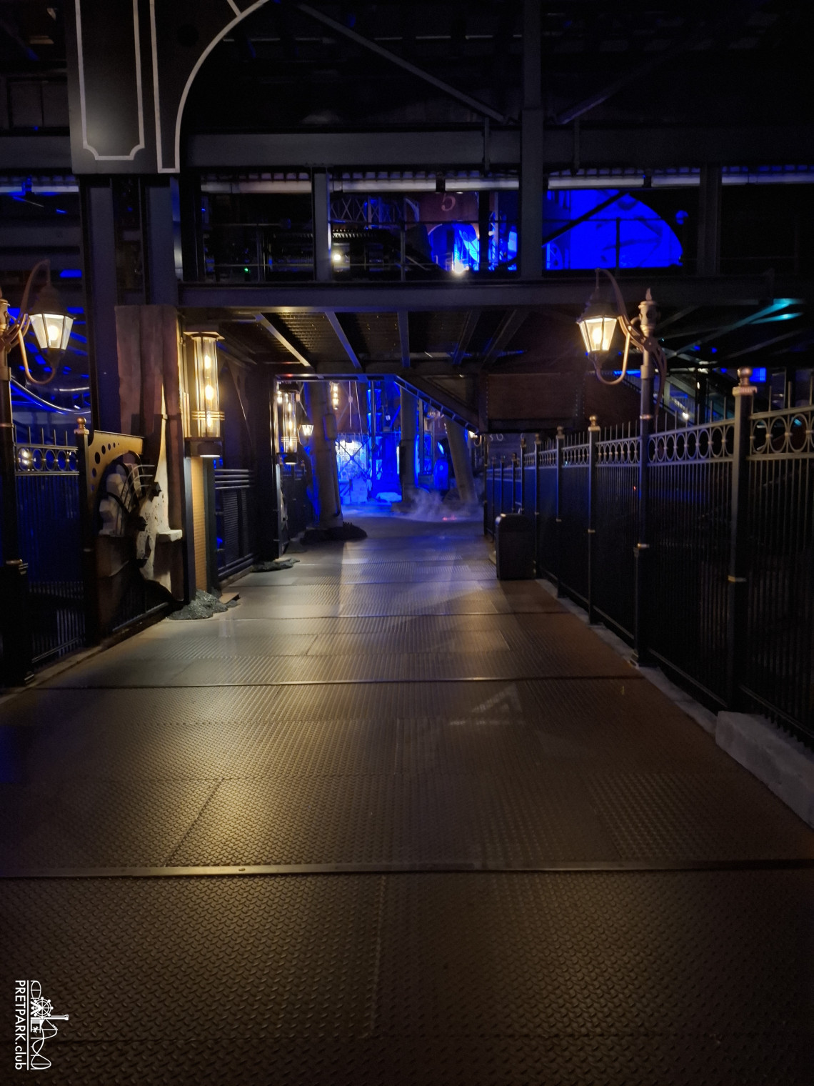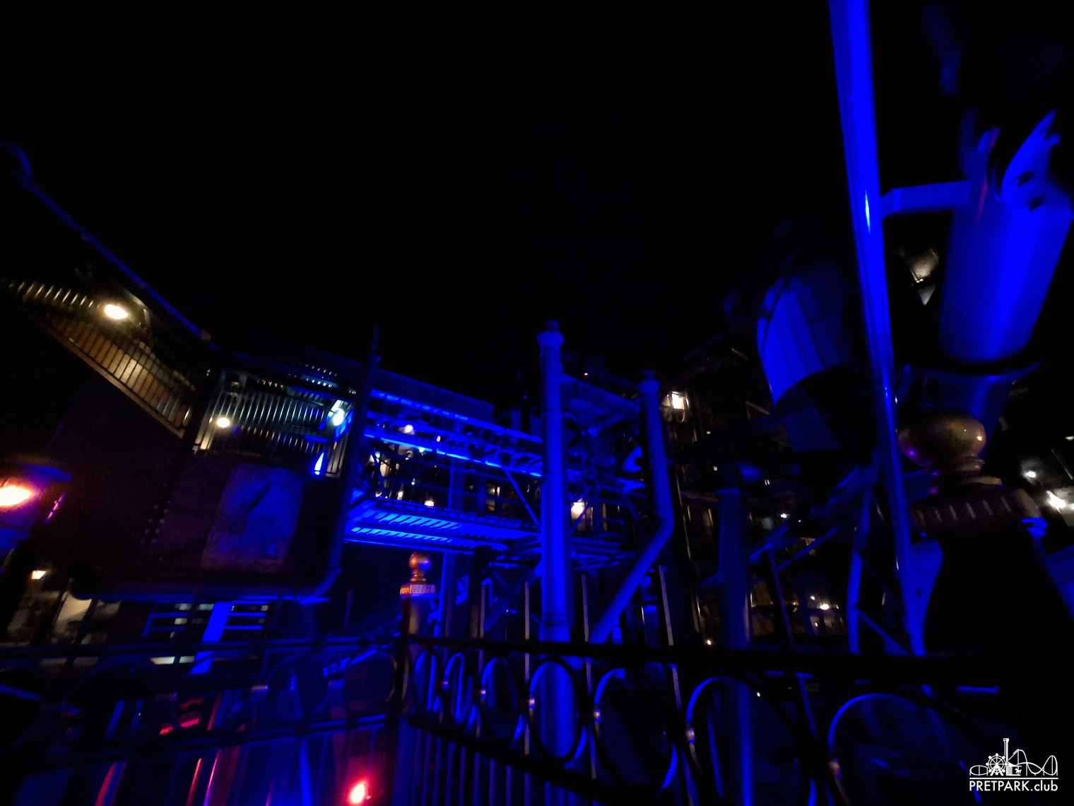 Na het diner namen we de lift naar de 4e verdieping van de B-Sectie voor een prachtig uitzicht over één van de mooiste themagedeeltes van Europa. Toen de zon volledig verdwenen was en de lichten aan gingen, maakten we nog een exclusief rondje door het gesloten Rookburgh. In het donker is dit gebied magisch en lichtelijk onheilspellend, volop fotomomenten.