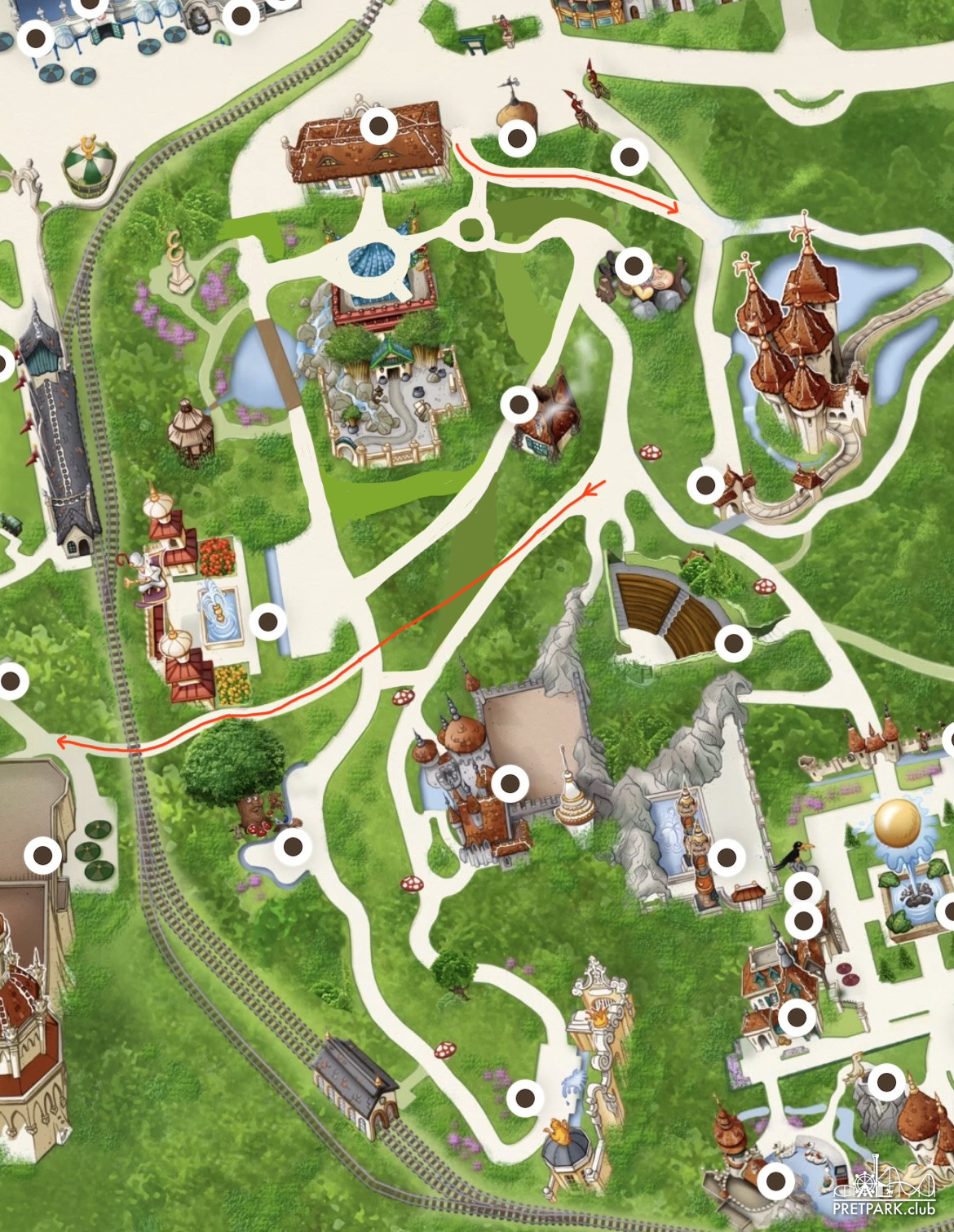 Pretparkgenot Het meest interessante nog aan deze tekeningen is dat het een beeld geeft van de nieuwe padenstructuur in ieder geval van de tweede helft van het bos. Giertje64 heeft op Bluesky deze tekening over een oude plattegrond van het sprookjesbos heen gelegd.